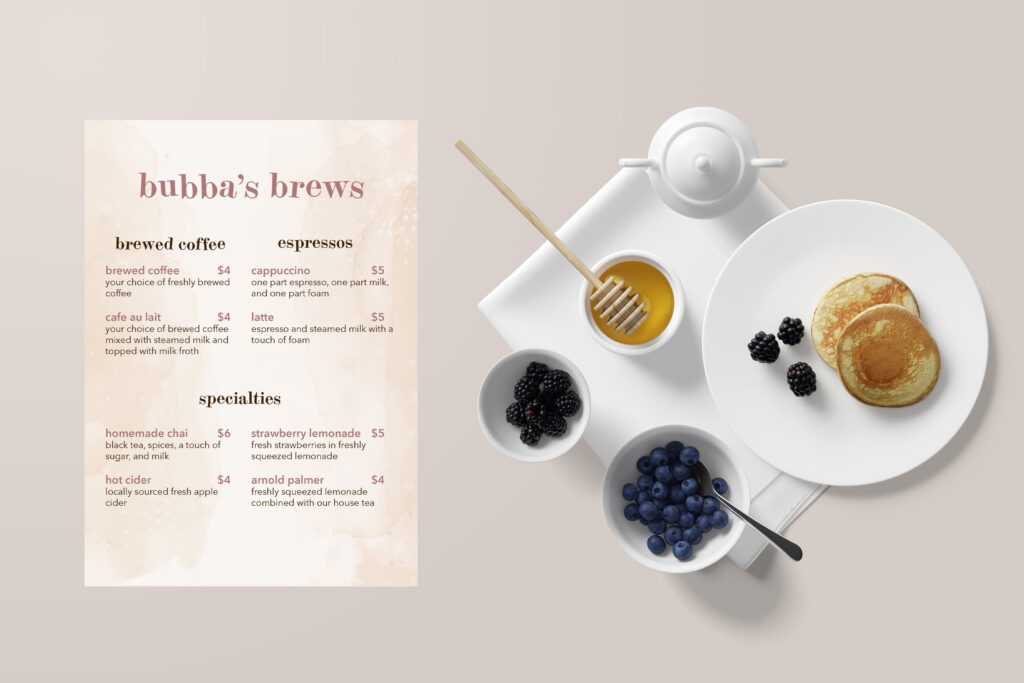 Featured is a menu created for Bubba’s Brews, coffee shop developed for a graphic design course.